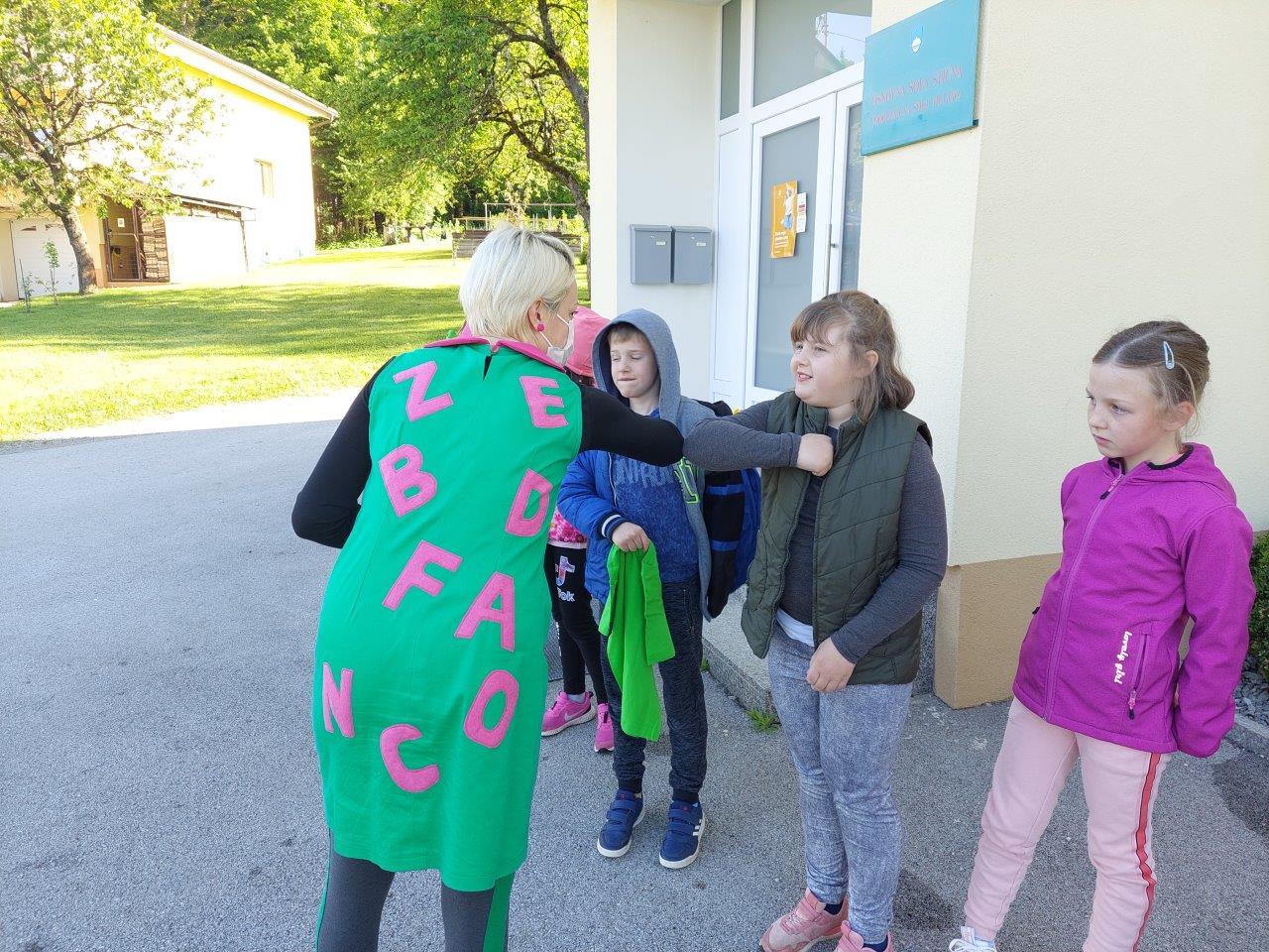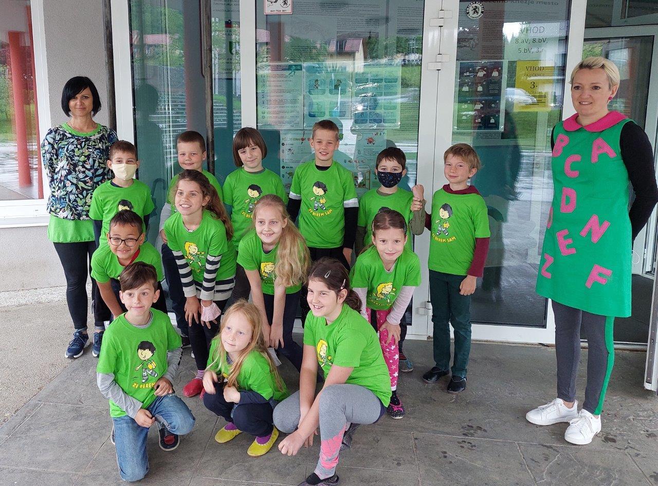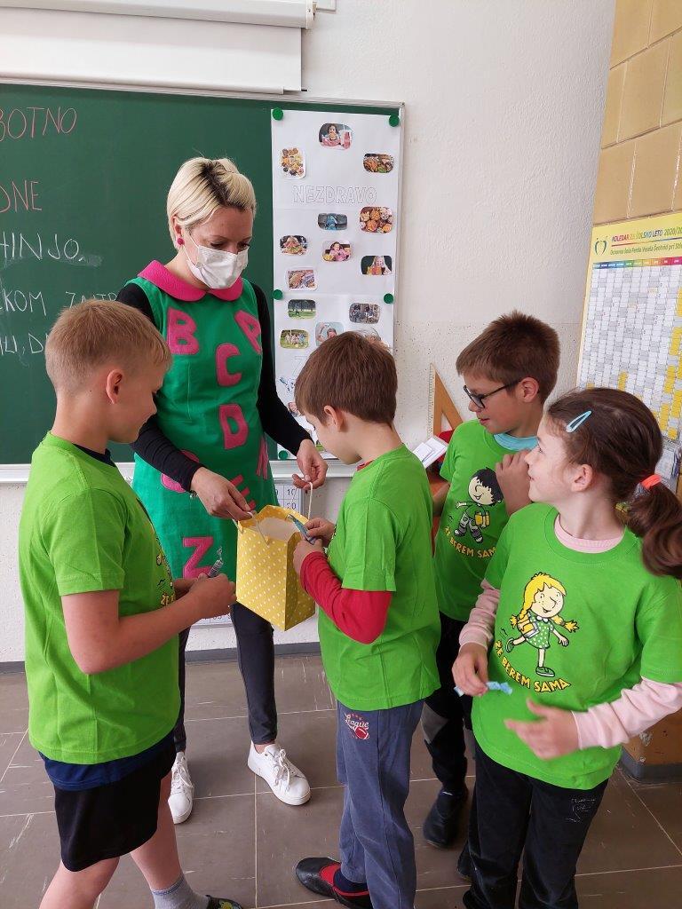 Knjižničarke iz knjižnice Ivančna Gorica so obiskale vse drugošolce kar pred njihovo šolo. Zelena bralka Tinca (knjižničarka Anita Globokar) je otrokom čestitala in povedala, da mora tudi sama še veliko brati, da bo postala dobra bralka. Sedaj je še malo zelena kakor jabolko. In več ko bo brala, bolj bo zorela, manj se ji bo zatikalo in bolj bo razumela prebrano. Potem je slavnostno podelila učencem zelene majice in skupaj so se fotografirali. V razredu smo jim pripravili še eno presenečenje, namreč Mestna knjižnica Grosuplje je za drugošolce pripravila virtualno predstavo Po Sloveniji s popotnikom Jakom, s katero so učenci spoznavali kulturne znamenitosti Slovenije na šaljiv način. Tisti dan je bil zanje še posebno prazničen.