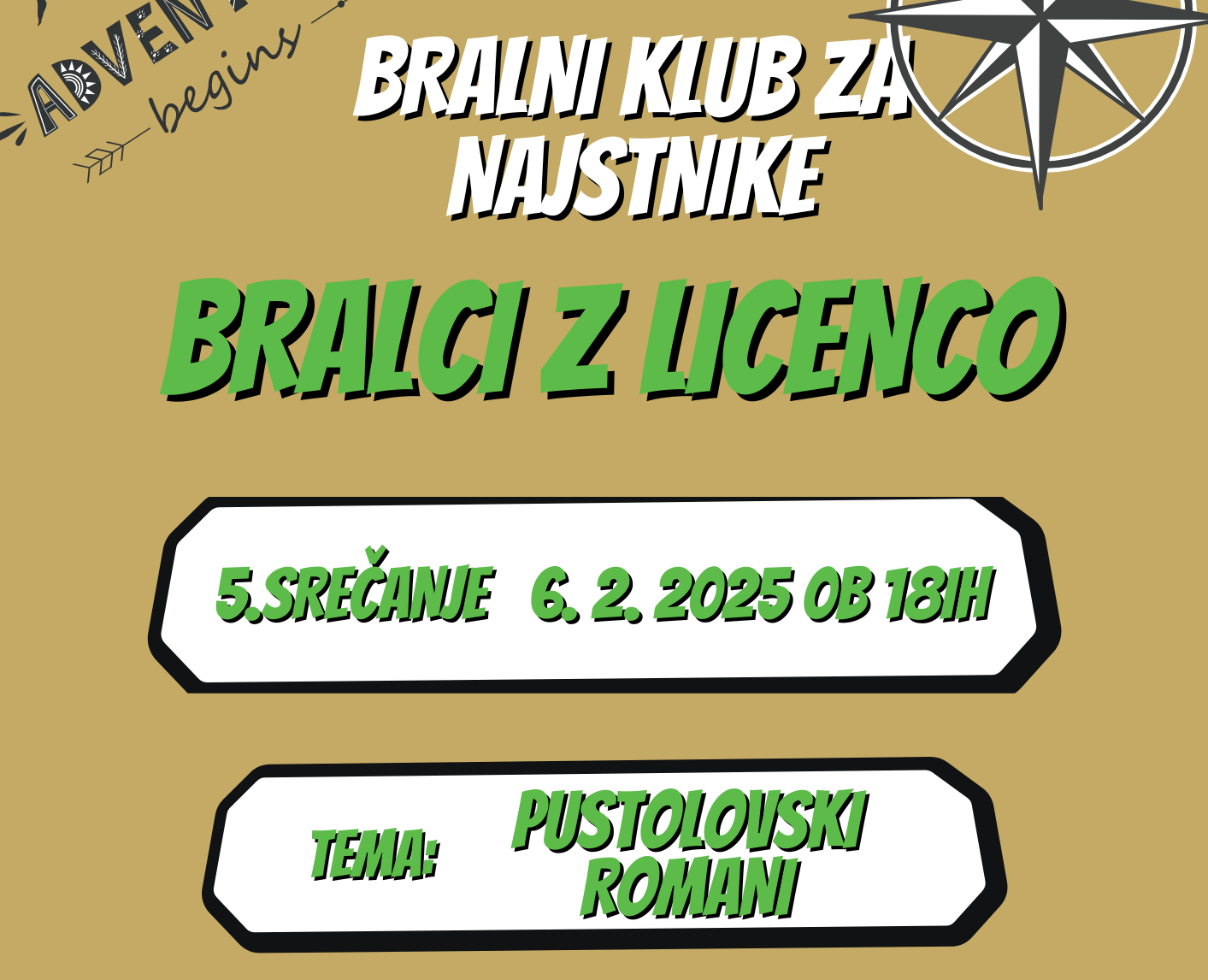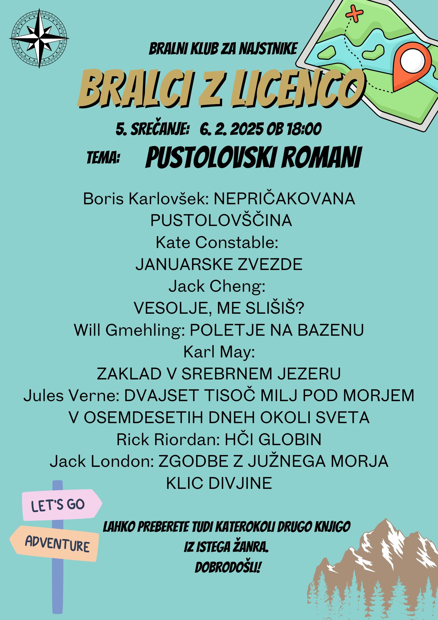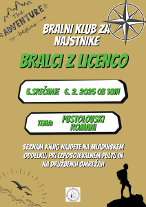 Vse Bralce z licenco in tiste najstnike iz zadnje triade OŠ, ki radi berete, še rajši pa se pogovarjate, vabimo na že 5. srečanje bralnega kluba za najstnike, ki bo v četrtek, 6. 2. 2025, ob 18:00. Tokratna tema so pustolovski romani! Ob čaju in piškotih pogovor hitro steče in po navadi ga ustavi šele zaprtje knjižnice. Vabljeni!