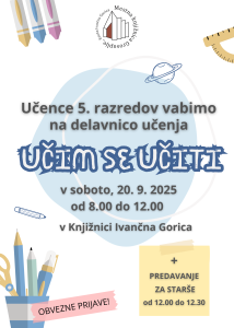 V soboto, 20. septembra 2025, ob 8. uri vabimo učence 5. razreda osnovne šole na delavnico učenja Učim se učiti. Prijave so obvezne, pošljite jih na e-naslov: izposojaivg@knjiznicagro.si ali pokličite: 01 787 81 21.