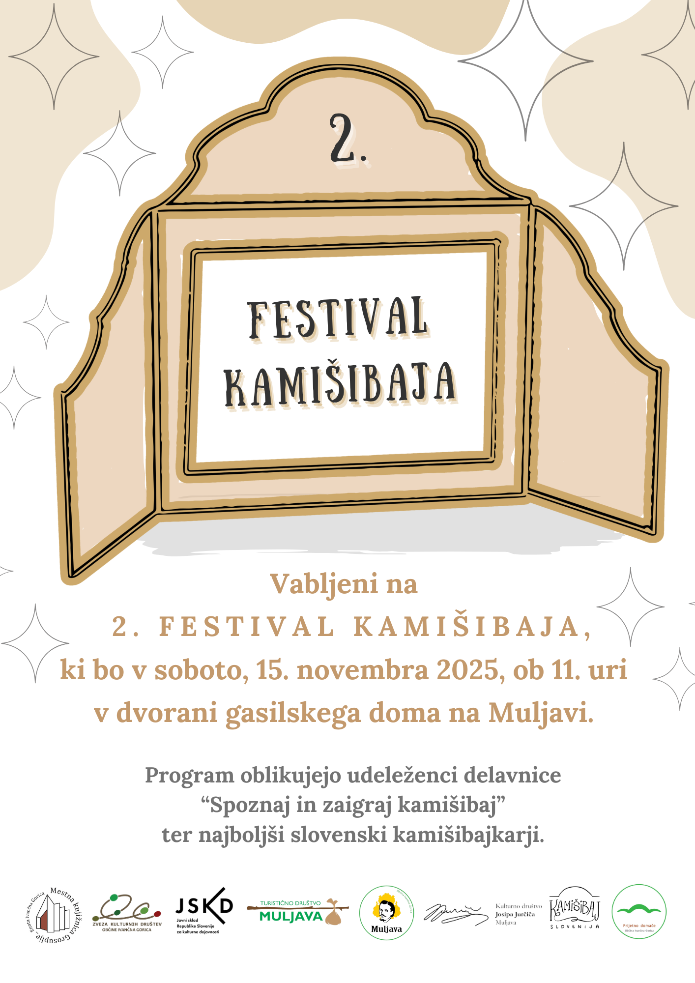 Vabimo vas na 2. Festival kamišibaja, ki bo v soboto, 15. novembra 2025, ob 11. uri v dvorani gasilskega doma na Muljavi. Nastopili bodo udeleženci delavnice Spoznaj in zaigraj kamišibaj ter najboljši slovenski kamišibajkarji.