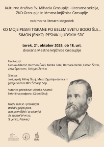 V torek, 21. oktobra 2025, ob 18. uri v sodelovanju s Kulturnim društvom Sv. Mihaela Grosuplje – Literarna sekcija in ZKD Grosuplje vabimo v dvorano Mestne knjižnice Grosuplje na literarni dogodek Ko moje pesmi tiskane po belem svetu bodo šle – Simon Jenko, pesnik ljudskih src.