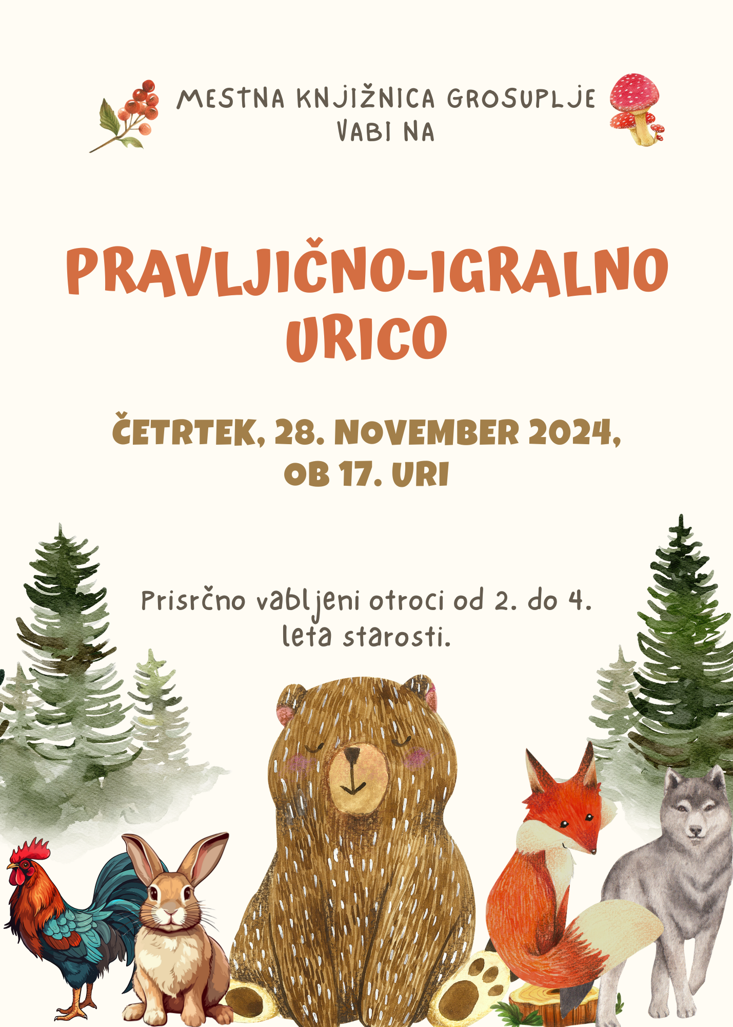 V torek, 28. novembra 2024, ob 17. uri vabimo otroke od 2. do 4. leta starosti na pravljično-igralno urico.