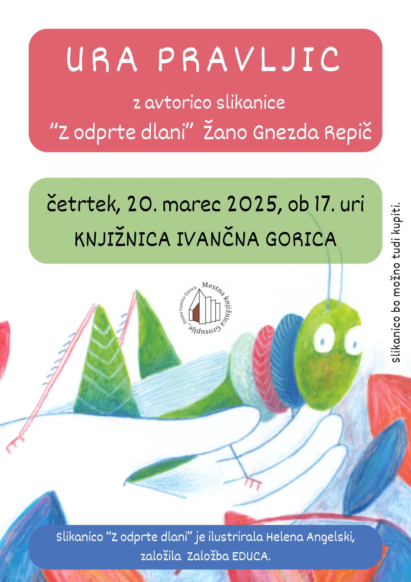 Otroke vabimo na uro pravljic z avtorico slikanice Z odprte dlani Žano Gnezda Repič, dobimo v se v Knjižnici Ivančna Gorica, v četrtek, 20. marca 2025, ob 17. uri.