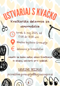 V torek, 6. maja 2025, ob 17. uri vabimo osnovnošolce na kvačkarsko delavnico Ustvarjaj s kvačko. Naučili se bomo nekaj osnov kvačkanja in skupaj ustvarili prvi izdelek.